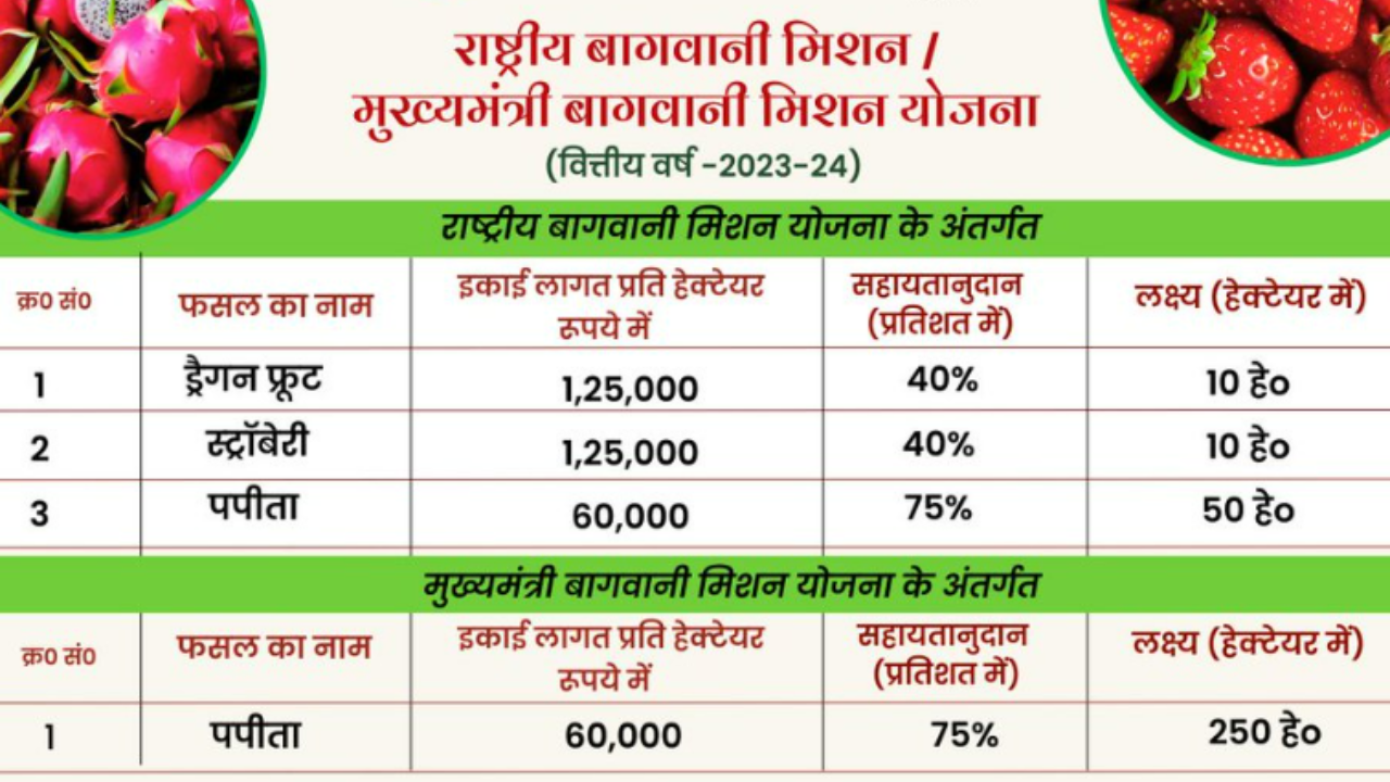 ड्रैगन फ्रूट और स्ट्रॉबेरी की खेती के लिए 40 प्रतिशत तक सब्सिडी दी जाएगी। सरकार ने ड्रैगन फ्रूट और स्ट्राबेरी की खेती के लिए प्रति हेक्टेयर लागत 1 लाख 25 हजार रुपये तय की है। इनके लिए किसान को लागत का 40 फीसदी यानी 50 हजार रुपये की सब्सिडी दी जाएगी।